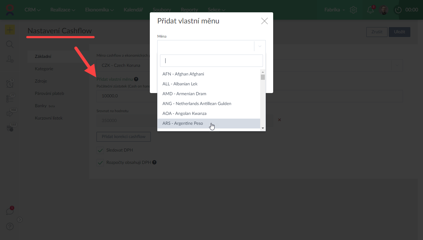 V Nastavení sekce Cashflow si můžete přidat jakoukoliv měnu, kterou Caflou ve výchozím stavu nemá: