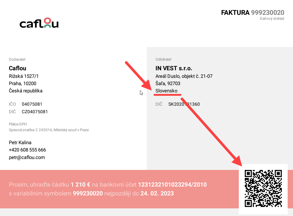 Slovensko má vlastní formát QR kódů a většina slovenských bank pak neumí pracovat s QR kódy, které jsou používány v Česku. Caflou nyní na fakturách, které mají příjemce na Slovensku, automaticky použije slovenskou verzi QR kódu: