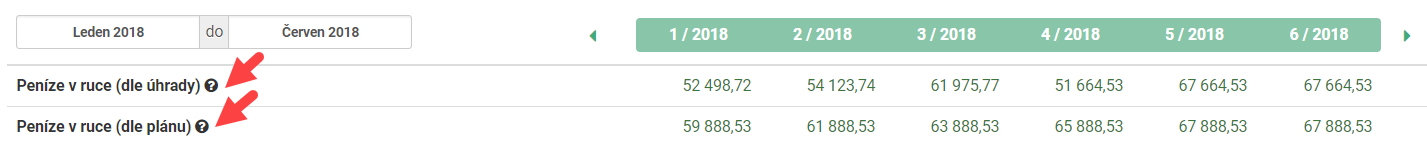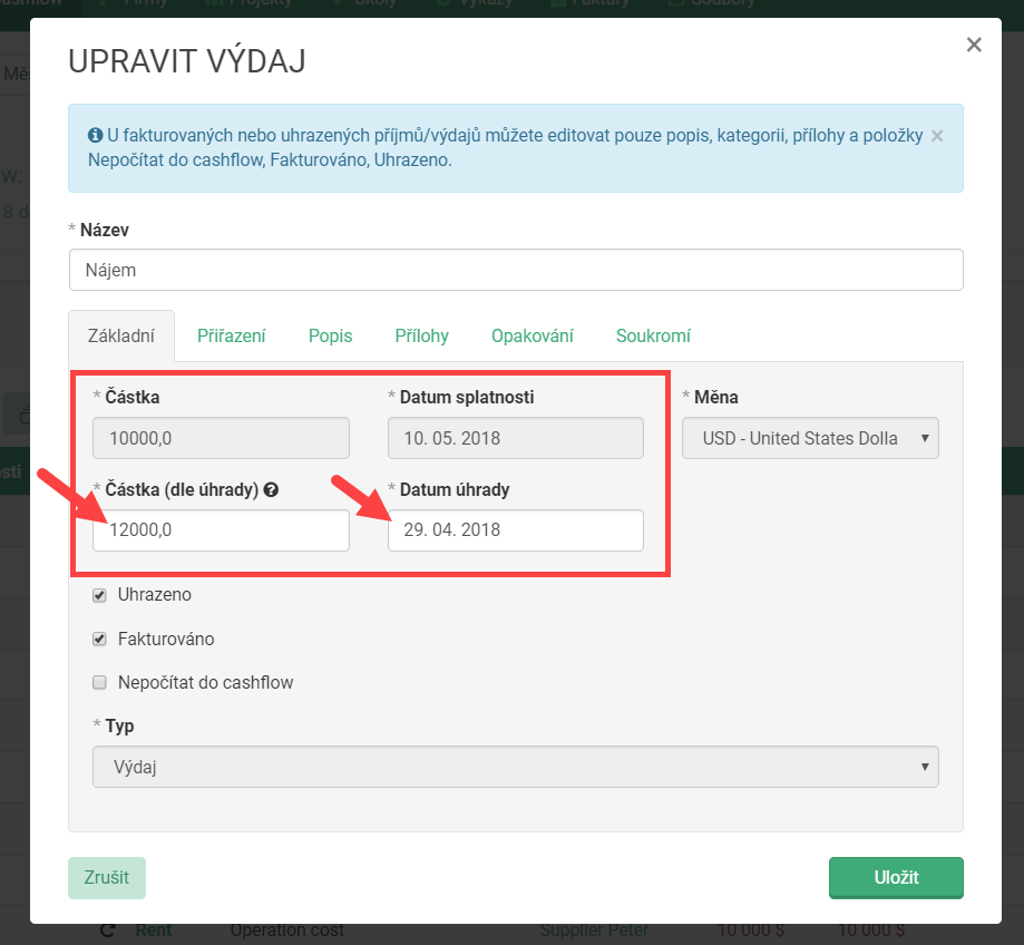 Využít možnosti porovnávat plán a realitu docílíte tak, že u příjmů a výdajů využijete nové atributy "Částka (dle úhrady)" a "Datum úhrady", které lze manuálně upravit. Atributy "Částka" a "Datum splatnosti" značí plán, atributy "Částka (dle úhrady)" a "Datum úhrady" značí realitu: