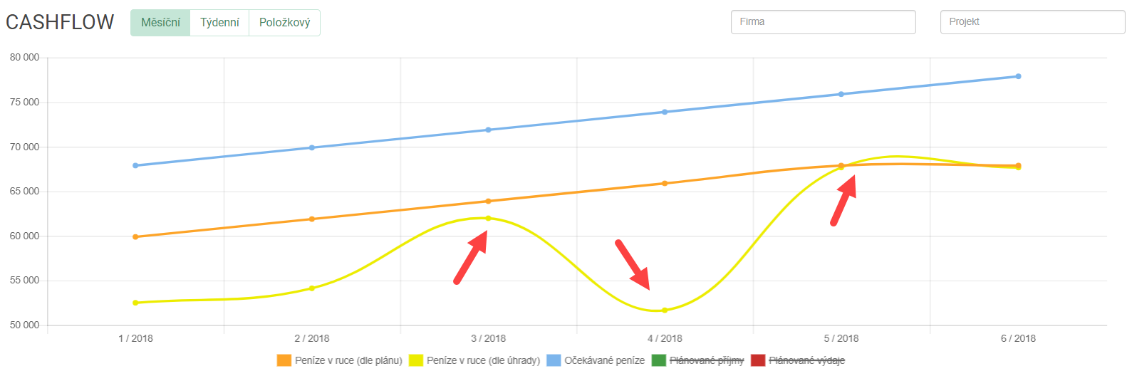 Máme pro vás další vylepšení cash flow, porovnejte snadno plán s realitou. V grafu vidíte plánované cash flow (oranžová čářa) a reálné cash flow (žlutá čára), tak jak úhrada opravdu proběhla (dle data úhrady a výše úhrady):