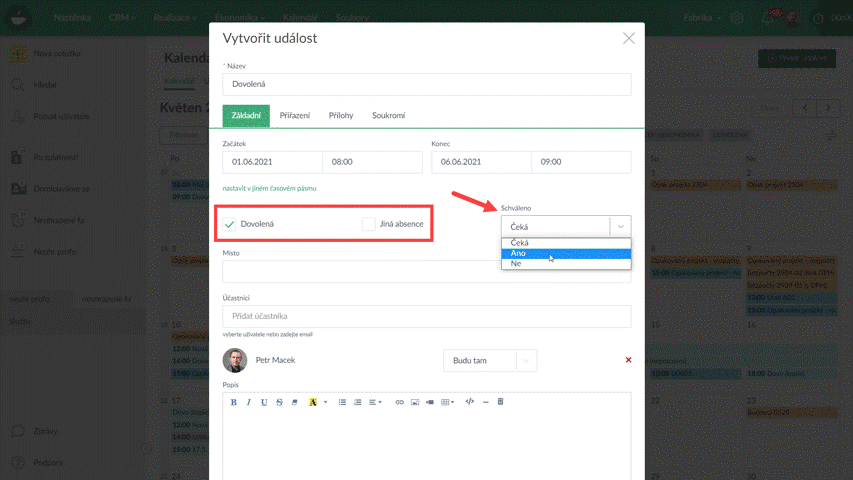 - Nově lze dovolené či jiné absence schvalovat - identicky jako u výkazů lze dovolenou schválit nebo zamítnout. K dispozici pro atribut "Schváleno" jsou stavy "Čeká", "Ano", "Ne".
