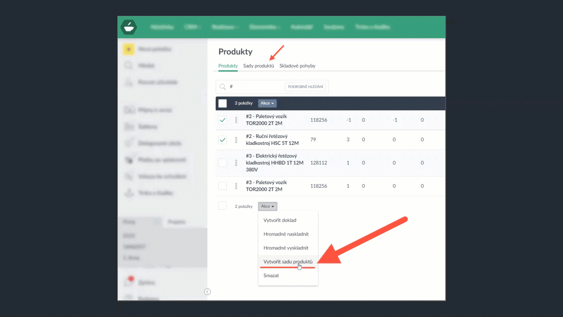 - Vytvořit sadu produktů - ze zvolených produktů vytvoříte sadu produktů (viz sekce výše)