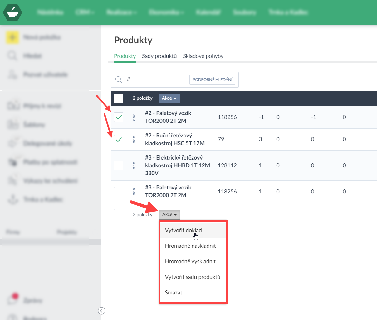 - Hromadně vyskladnit - najednou můžete ponížit množství více produktů na skladu