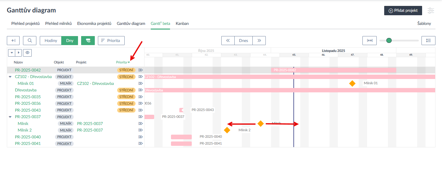 - řadit objekty i podle jiných atributů (např. priorit) než jen automaticky podle termínů (jako ve "starém" modelu)