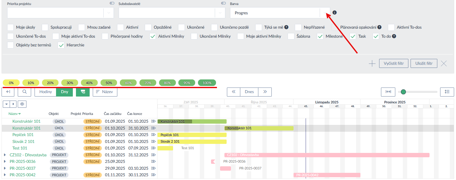 - efektivněji pracovat s filtry a barvami (lze zvolit např. obarvení objektů dle přiřazeného uživatele, priority nebo typu úkolu či projektu), kompaktností zobrazení nebo zoomem
