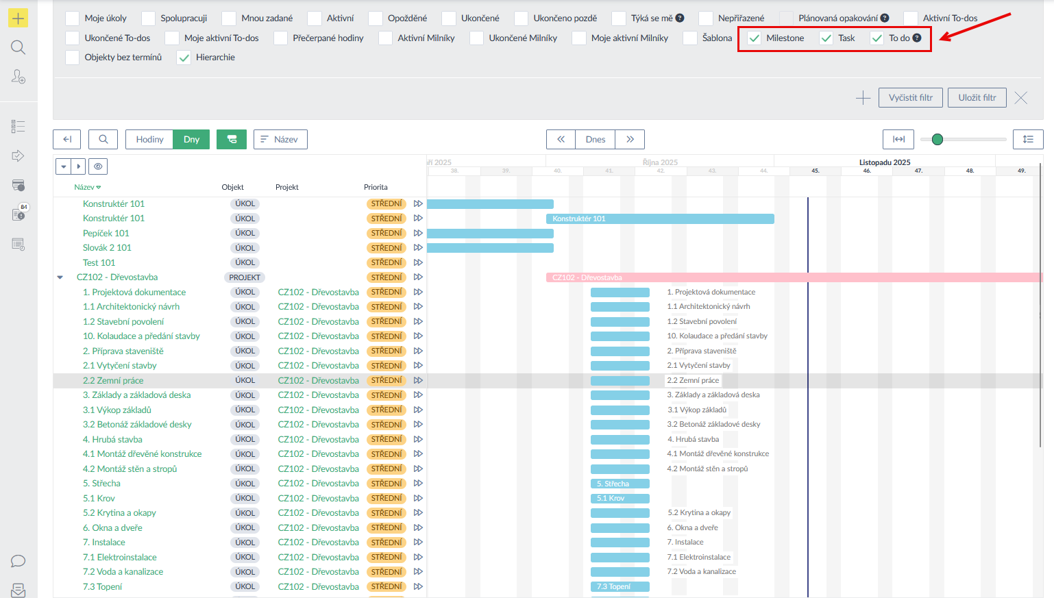 - nejen projekty a úkoly (původně vždy jen úkoly nebo jen projekty), ale v rámci jednoho pohledu (volitelně) můžete vidět projekty, úkoly, milníky i todočka