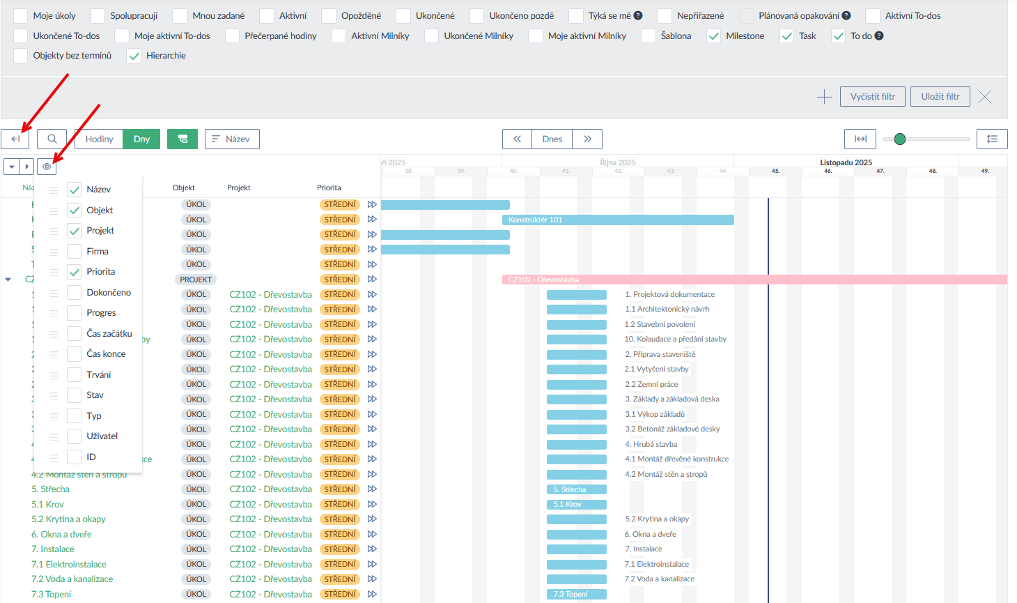 - pro zobrazené objekty lze v levém panelu zobrazit více informací (např. stav či typ úkolu, termíny, priority, nadřazené firmy, projekty či úkoly atd.)
