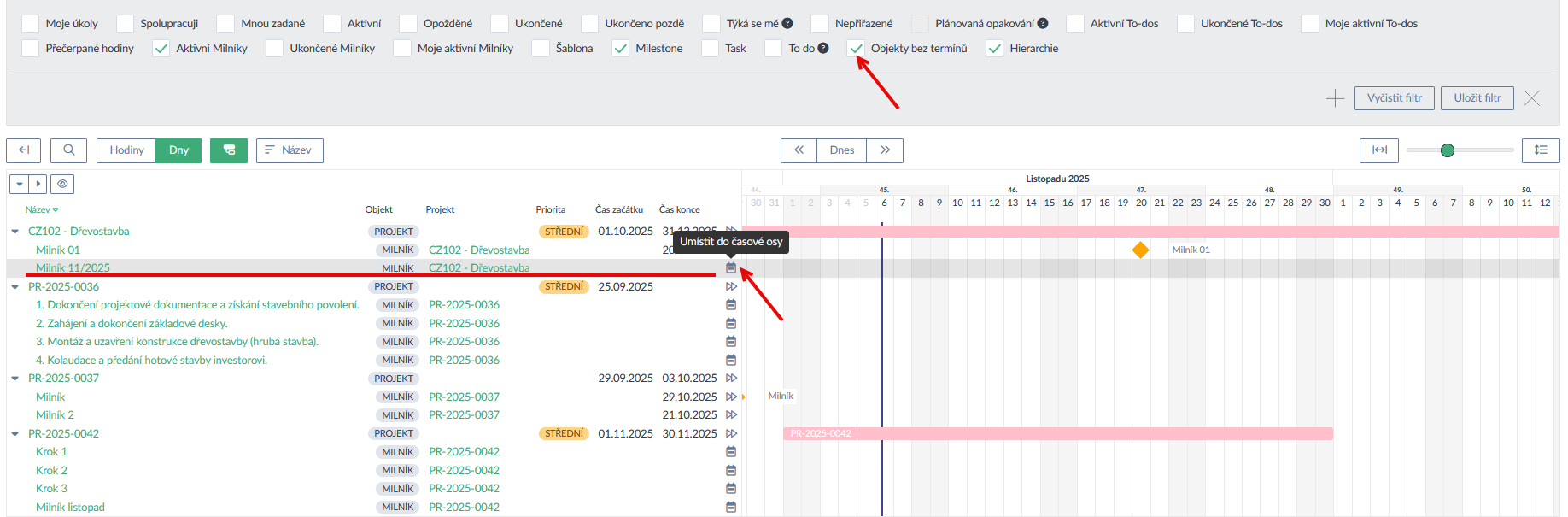 - zobrazit i objekty bez termínů (bez začátku a konce), přičemž je lze následně vložit na časovou osu