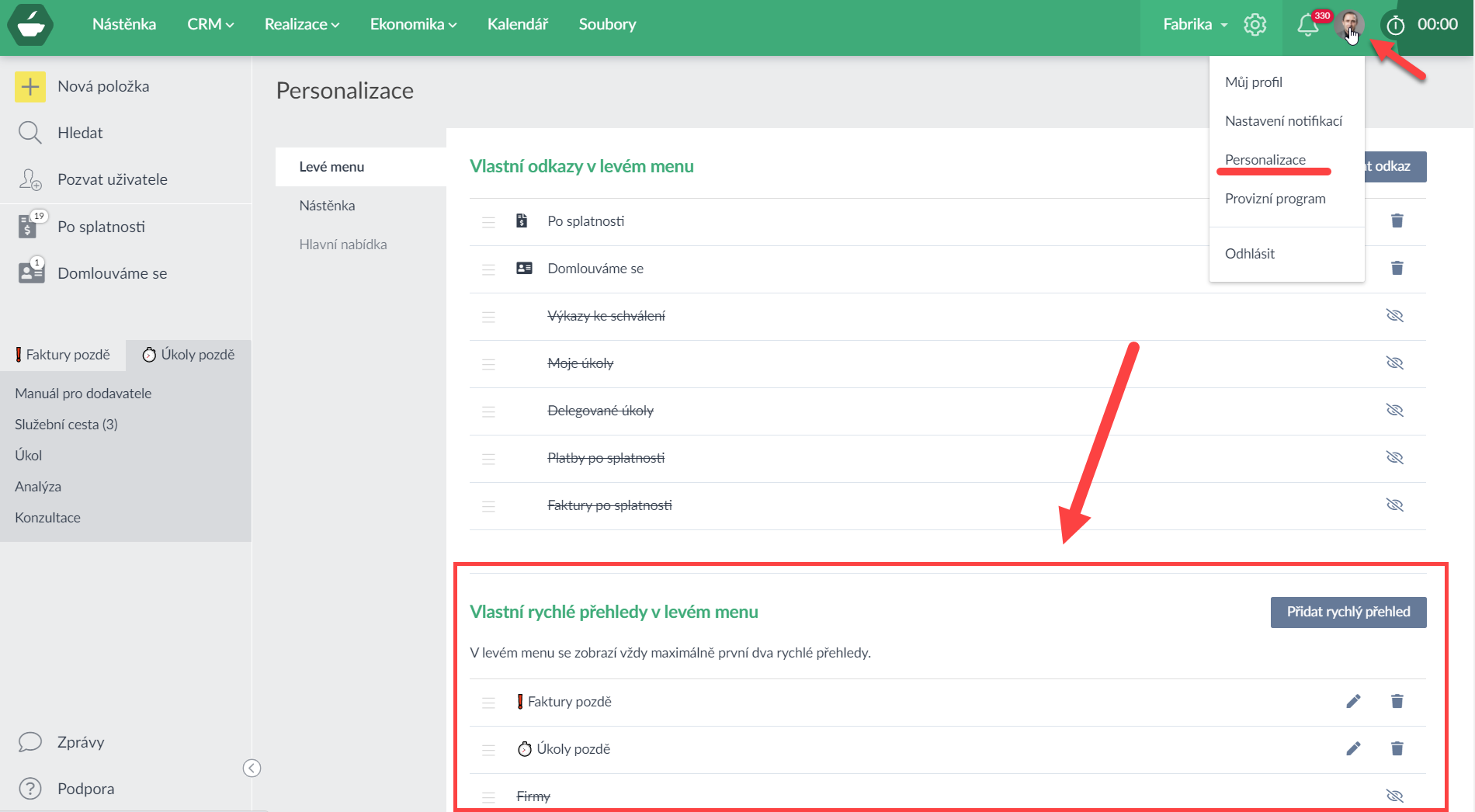 Ve stejném stylu jako vlastní rychlé odkazy nebo vlastní moduly na Nástěnce máte nově v rámci personalizace k dispozici možnost upravit si 2 rychlé přehledy v levém panelu.