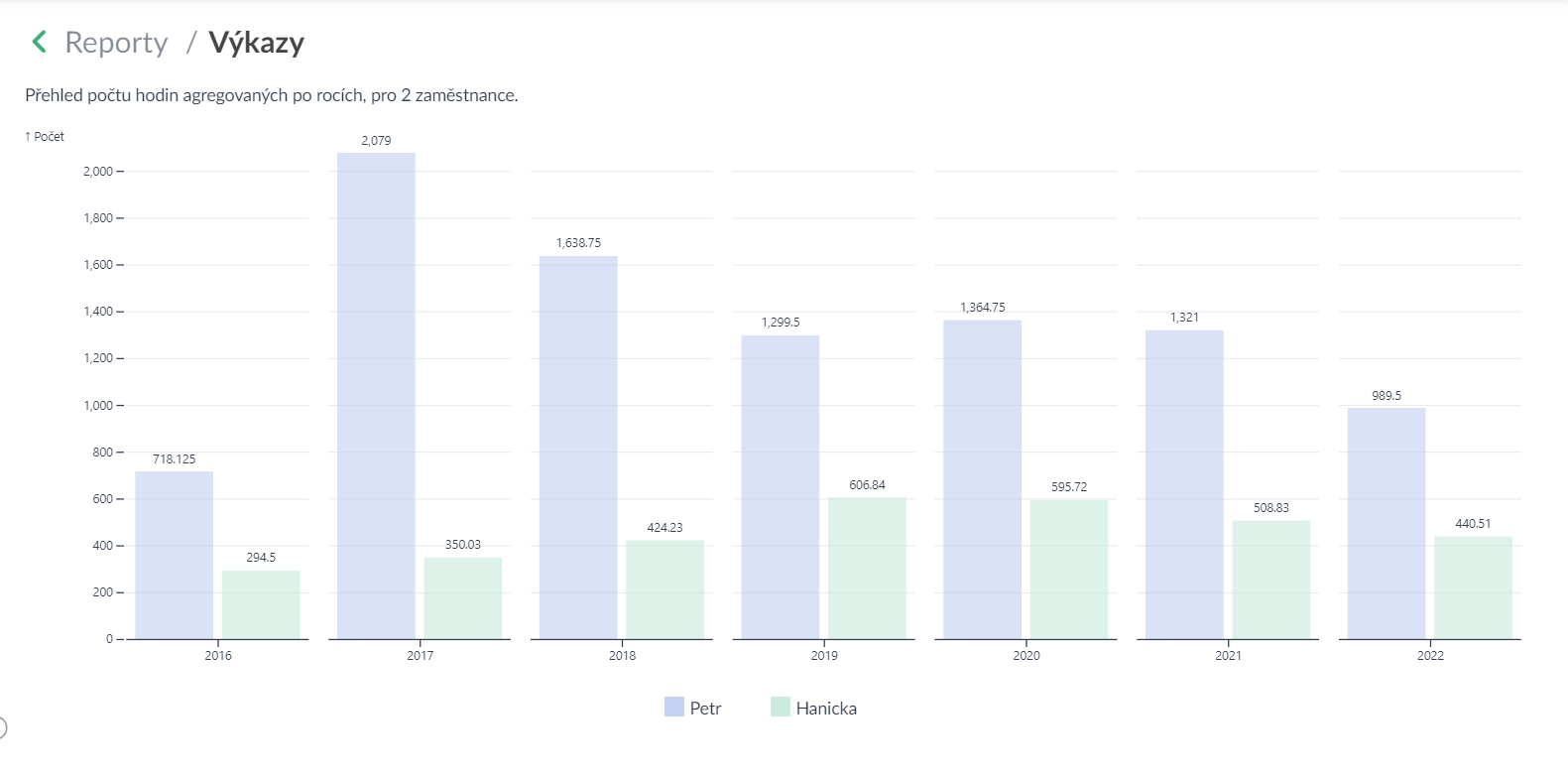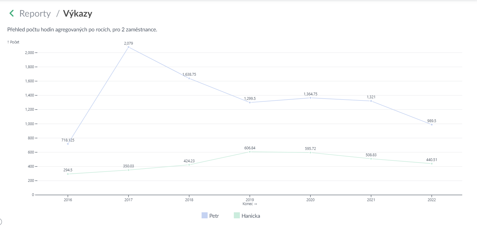V obrázcích vidíte pro ukázku porovnání počtu vykázaných hodin dvou uživatelů. Myslitelných porovnávacích grafů lze vytvořit opravdu hodně.