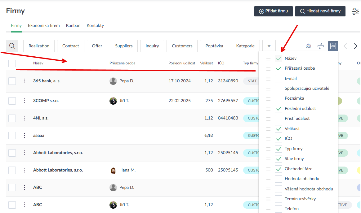Ukázka: viz výše, pro objekt Firmy jsme schovali atribut "Alias" a "Odhadovaná úspěšnost obchodu", nyní se vám tedy nebudou obrazovat v přehledu sloupců, filtrování ani v detailu Firmy.