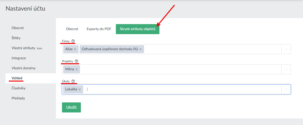 Pokud některé atributy vůbec nepoužíváte, lze je skrýt (pro celý účet a všechny jeho uživatele). Tuto možnost naleznete u Firem, Projektů a Úkolů. Skryté atributy pak nelze vyplňovat, zobrazovat v přehledech sloupců, v detailech objektů ani je nenajdete ve filtrování.