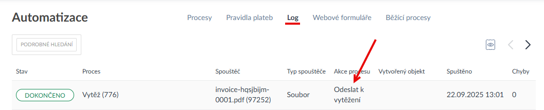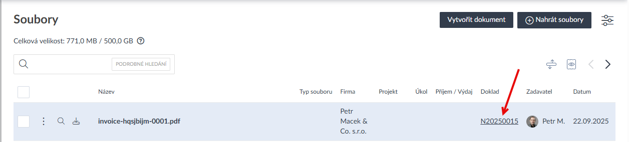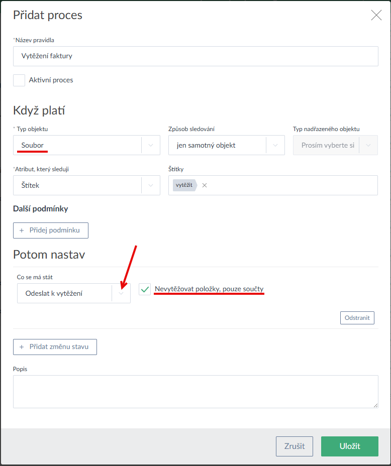 Mimo standardních akcí (jako např. změna typu, přidání štítku, přiřazení firmy či projektu nebo vyvolání nějaké akce) je novinkou možnost automaticky odeslat daný soubor (např. fakturu) k vytěžení při splnění zadaných podmínek.