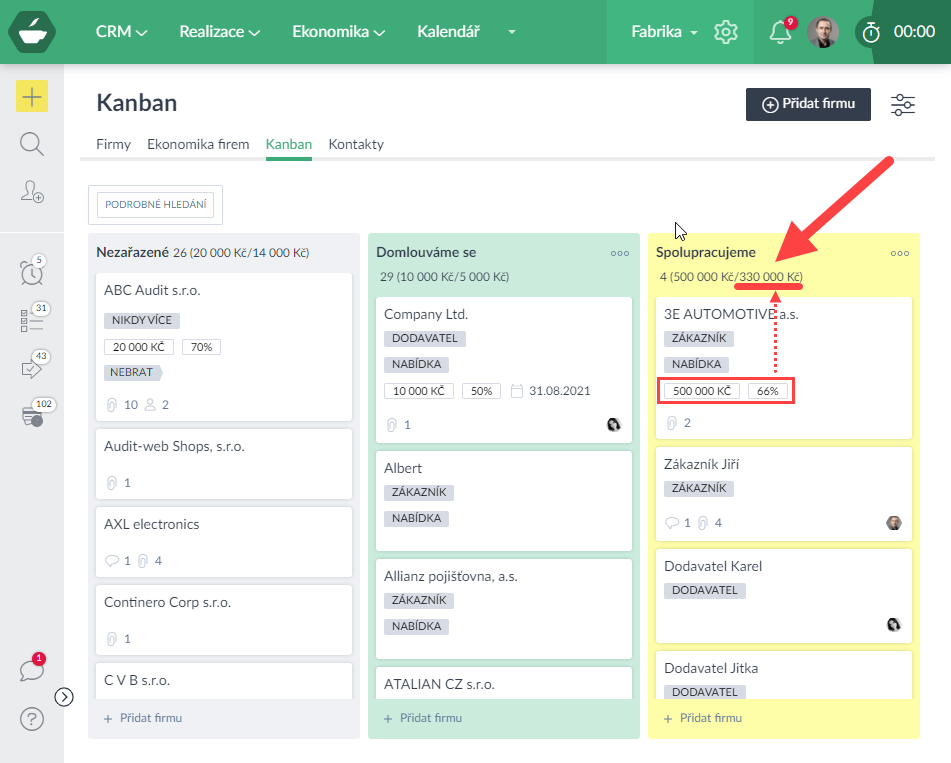 Drobné ale praktické vylepšení obchodního trychtýře u firem (Kanban firem v Caflou). Pokud u firem u hodnoty obchodu evidujete i pravděpodobnost úspěchu, pak nyní do součtů dané vertikály vypočítáme váženou hodnotu dané vertikály (agregujeme hodnotu x pravděpodobnost z firem v dané vertikále). Mnohém lépe pak můžete plánovat své cashflow i práci, jelikož uvidíte, jaké příjmy lze z plánovaných obchodů očekávat.