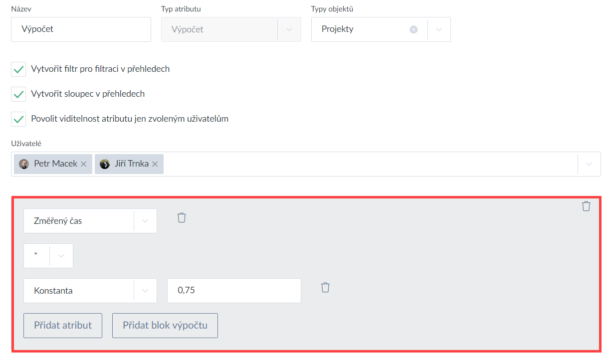 Nově si můžete vytvořit vlastní atribut typu "výpočet", který umožní zadat výpočet na základě číselných atributů daného objektu (což mohou být statické atributy ale i atributy dynamické jako vykázaný či změřený čas, uhrazené příjmy či výdaje apod.).