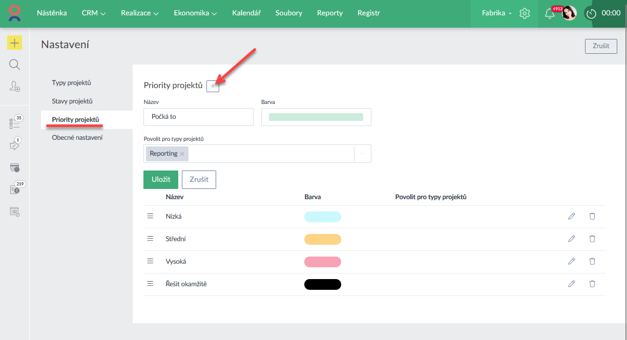 Doposud byla v sekci Projekty a Úkoly pevně daná sada priorit a jejich barev bez možnosti změn. Nově lze vytvořit vlastní priority, určit si k nim vlastní barevnost a omezit i pro jaké typy úkolů a projektů, lze vlastní priority nastavit.