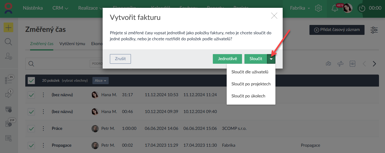 Vyberte si, zda chcete jednotlivé výkazy nebo změřené časy vypsat na fakturu jednotlivě jako položky faktury, nebo je sloučit do jedné položky, agregovat po projektech nebo úkolech, případně je chcete roztřídit do položek podle uživatelů (plaí jen pro změřené časy, ne výkazy).