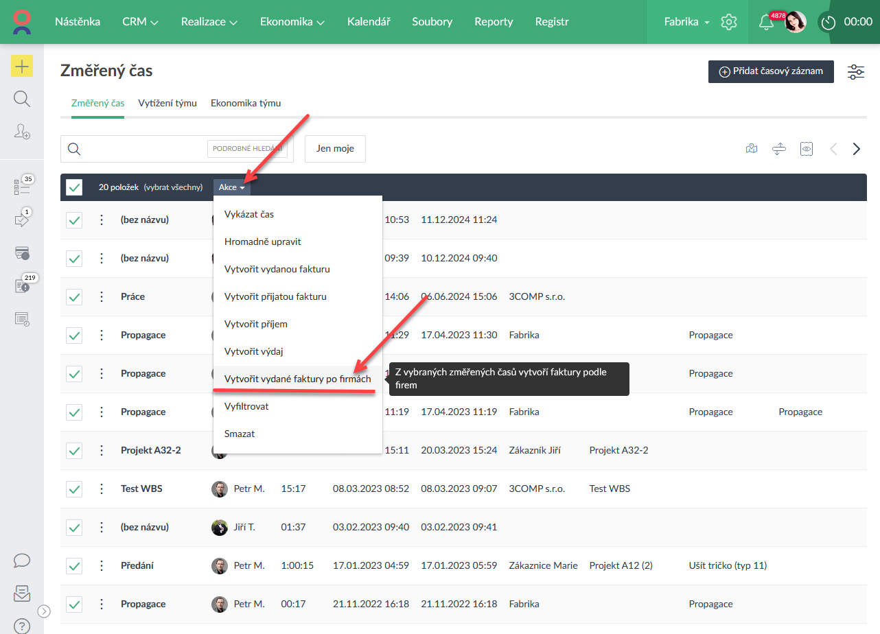 Pokud máte větší množství výkazů nebo změřených časů, které náleží různým firmám a je třeba z nich vytvořit faktury, pak je zde pro vás ideální řešení v podobě nové možnosti hromadně "Vytvořit vydané faktury po firmách".