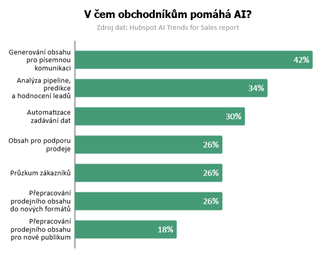 Adopce AI a jazykových modelů v obchodních týmech prudce roste. Za jediný rok se podle reportu platformy Hubspot počet obchodníků využívajících umělou inteligenci téměř zdvojnásobil (z 24 % v roce 2023 na 43 % v roce 2024).