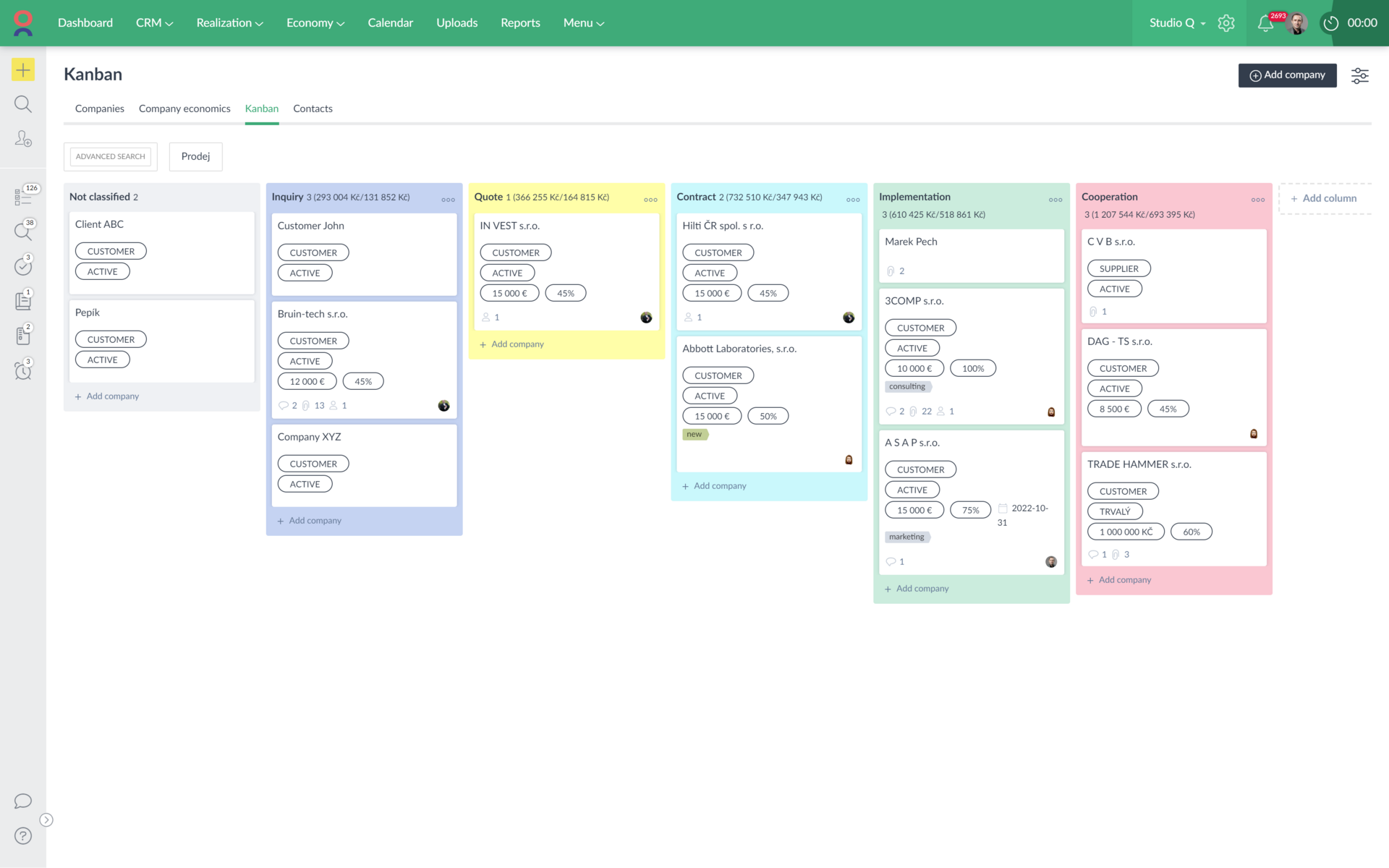 - Správa kontaktů: CRM řešení sleduje informace o zákaznících, interakcích a vztazích s nimi v centralizované databázi. Například funkce CRM nabízená systémem Caflou umožňuje uživatelům pohodlně a přehledně uspořádat a vizualizovat všechna důležitá data týkající se zákazníků. Můžete si jednoduše prohlédnout stavy a obchodní fáze, zaměstnance zodpovědného za daného klienta, konkrétní obor společnosti, její umístění a další důležité informace.