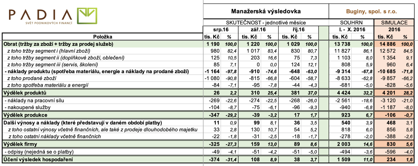 Nastavili jsme tedy automatizovaný manažerský pohled na data z účetnictví. Velmi se osvědčila měsíční výsledovka na peněžní bázi zobrazující nákupy a tržby, jejichž rozdíl je zvýrazněn jako výdělek produktů. Jednostránkový přehled dále zachycuje náklady na pracovní sílu a další služby, které souvisejí spíše s obdobím a jsou tak více méně nezávislé na konkrétních prodejích, nicméně jsou nezbytné pro dosažení tržeb. Ty poté ovlivňují výdělek produkce. Ten se od účetního hospodářského výsledku liší tím, že neobsahuje účetní položky, které většinou nemá firma pod kontrolou (zejména kurzové zisky a ztráty), a dále náklady, které nejsou výdaje (zejména odpisy). Manažerská výsledovka přinesla obrat v náhledu na řízení cash flow v Buginách.