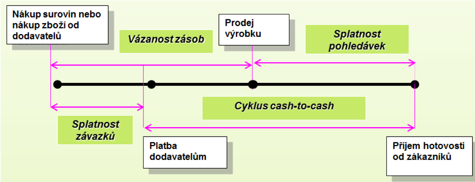 Určitou dobu trvá výrobní proces, který začíná nákupem materiálu/surovin, pokračuje výrobou až k vyskladnění výrobku k prodeji, respektive do fakturace dodávek či odvedené práce. Při prodeji jsou v účetnictví zaznamenány tržby, nicméně podle skutečné splatnosti faktur ještě nějaký čas trvá, než dojde i k inkasu peněz z prodejů. Oba časy, jak vázanosti zásob ve výrobním procesu, tak splatnosti pohledávek společně tvoří dobu provozního cyklu.