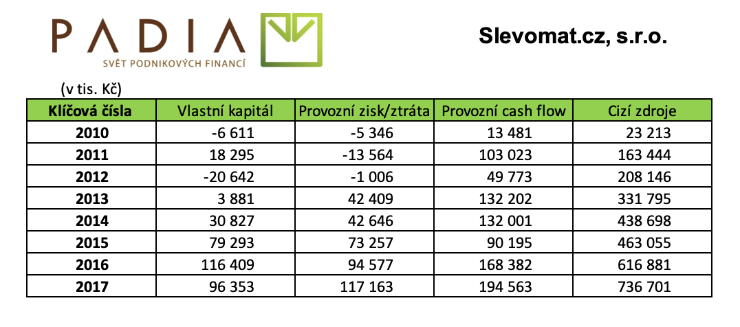 První rok své existence začínala firma s 200 tisíci korunami a uzavírala ho se 13 miliony korun. Ačkoliv i druhý rok (2011) přinesl firmě ztrátu, provozní cash flow bylo již přes 100 milionů korun a vlastní kapitál dosáhl kladné hodnoty díky navýšení kapitálových fondů (tj. příplatky mimo základní kapitál). V tomto roce utlumil Slevovat výnosy ze skutečných nákupů a prodejů voucherů. Hlavním zdrojem výnosů se staly smluvní provize z pronájmu reklamní platformy, na které zájemci inzerují nabídky se slevou zákazníkům, a zprostředkování smluv na internetu.