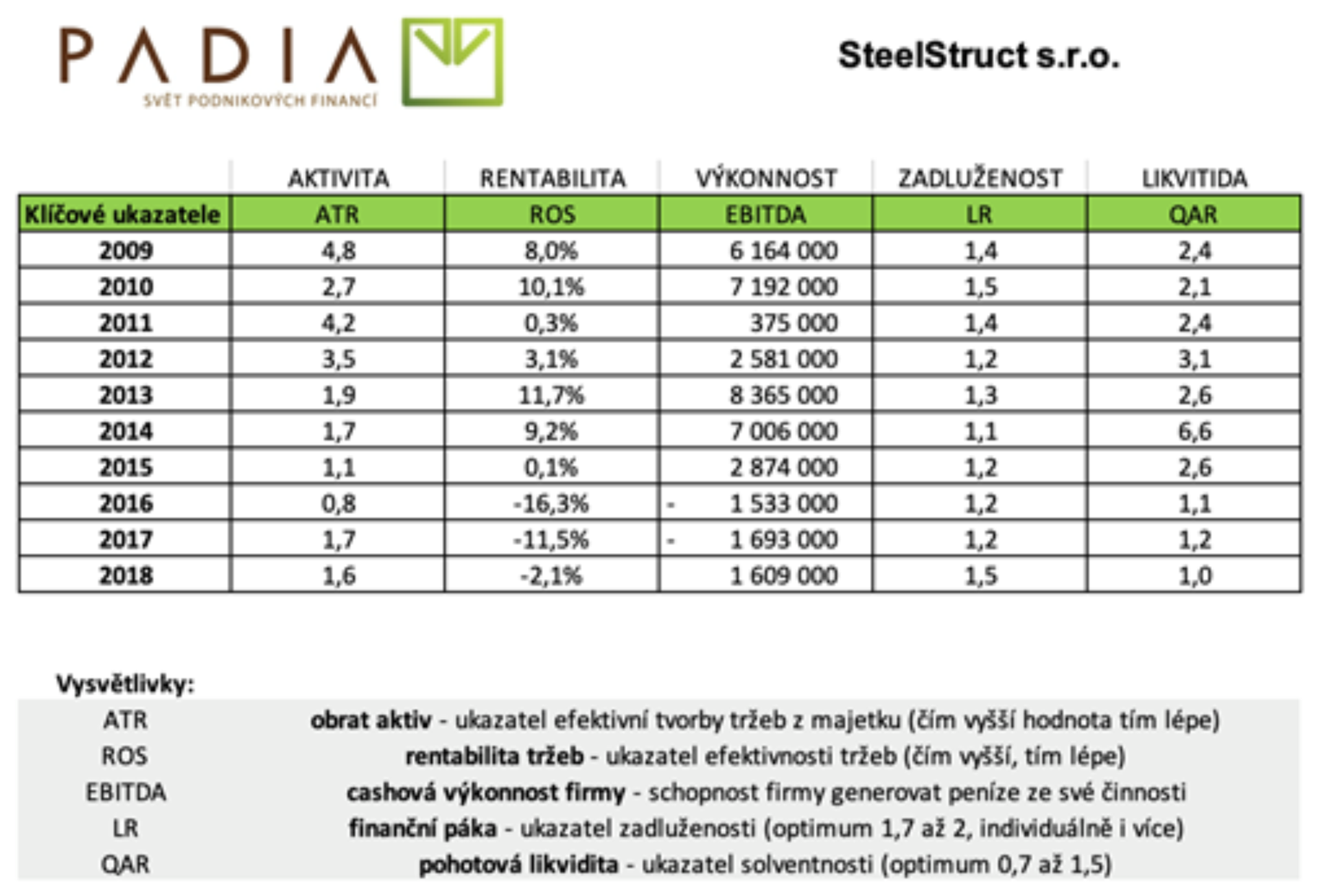 V roce 2015, kdy se původně obchodní společnost začala přetvářet na výrobní firmu, se začala výrazně zhoršovat rentabilita a likvidita firmy. Ačkoli obraty firmy se díky navyšujícím tuzemským i zahraničním zakázkám stále rostly, poprvé v historii firmy se objevily ztráty. Účetní ztrátu lze při dobré kondici firmy ustát dokonce i několik let po sobě. Problém v praxi však způsobí nedostatečná tvorba peněz, v případě SteelStruct sledovaná majiteli prostřednictvím hodnoty cashové výkonnosti firmy EBITDA. Ta byla v letech 2016 a 2017 záporná. Problémy s cash flow na sebe nenechaly dlouho čekat. Nejdříve však bylo potřeba pochopit příčiny současné ekonomické situace.