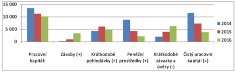 Čistý pracovní kapitál v letech 2014 až 2016 klesal z hodnoty 11,5 mil. Kč přes 7,3 mil. Kč na necelé 4 mil. Kč. Snižoval se tak finanční polštář ve vztahu k existujícím závazkům firmy. Navyšoval se stav zásob. Zcela zásadně se ztenčil stav disponibilních peněžních prostředků.