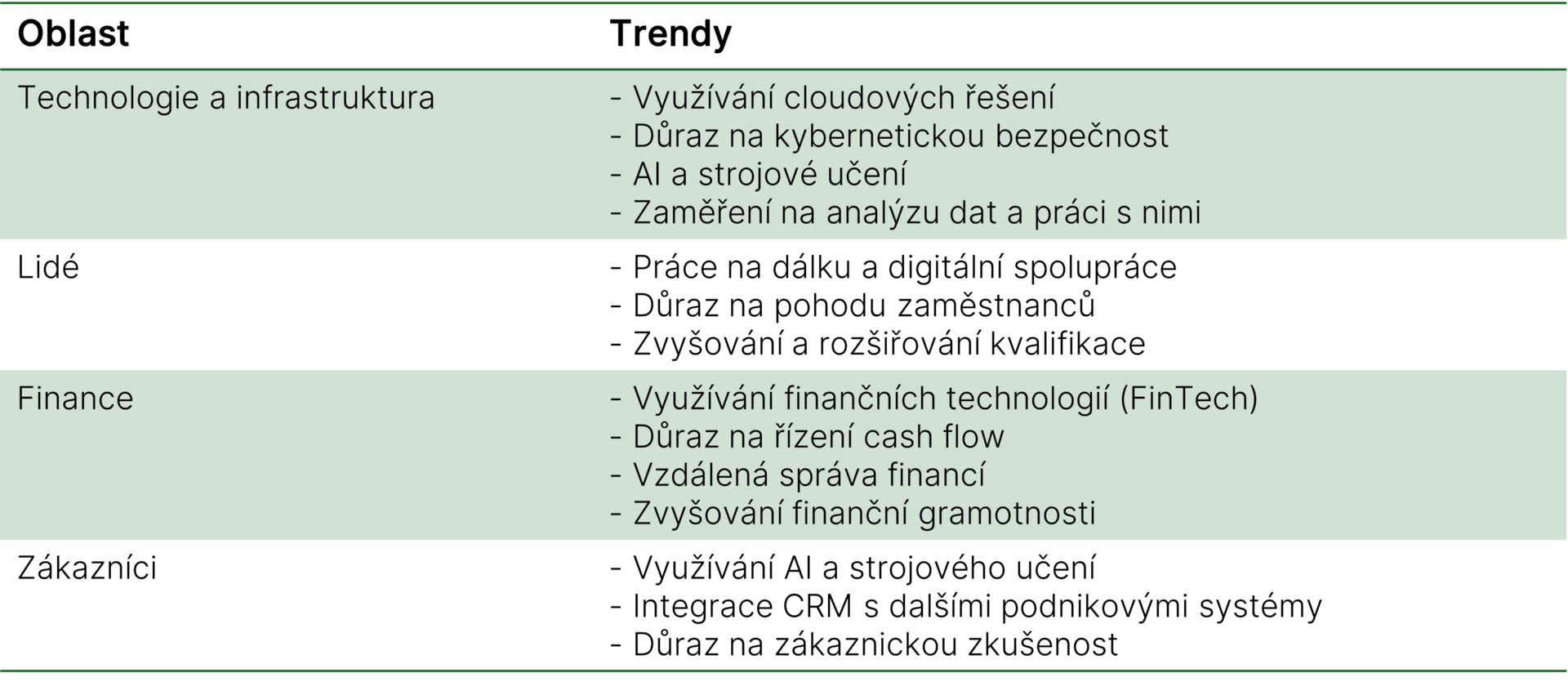 Představíme vám 14 trendů ve 4 oblastech podnikání. Stručné shrnutí najdete v tabulce a dále se na ně podíváme podrobněji.