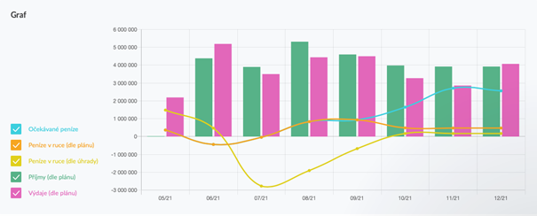 Např. níže uvedený graf cash flow v CAFLOU umožní vizualizovat předpokládaný vývoj situace, a jak si vaše finance vedou v porovnání plánu i reality podle faktických úhrad. Navíc pod grafem v aplikaci uvidíte přehledné detailní tabulky s různými pohledy na příjmy a výdaje firmy s oddělením DPH, podle kategorií, zdrojů, projektů a podobně.