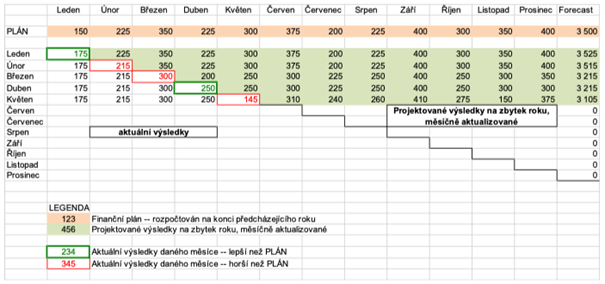 Ve výchozí podobě vodopádového schématu je uveden finanční plán na jednotlivé měsíce, ale mohou to být i týdny či jiná s uživateli dohodnutá frekvence reportování. Abychom mohli sledovat trendy vývoje a poučit se změn a třeba lépe odhadovat vývoj do budoucna, zaznamenáváme do zelených polí aktualizovanou predikci dlouhodobého plánu. Skutečné hodnoty vstupují do průsečíku daného měsíce ve sloupci i řádku. Například v lednu byla skutečná hodnota 175. Pokud šlo o zlepšení oproti předpokladu v plánu, je označena zeleně. V únoru je skutečnost horší než plán, hodnota 215 je tedy zvýrazněna červeně.
