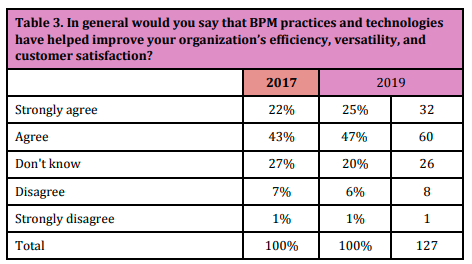 Podle zprávy State of Business Process Management 2020, 72 % dotázaných firem buď úplně souhlasilo nebo silně souhlasilo s tím, že řízení obchodních procesů podporuje zlepšení v jejich organizacích, včetně zvýšení spokojenosti zákazníků: