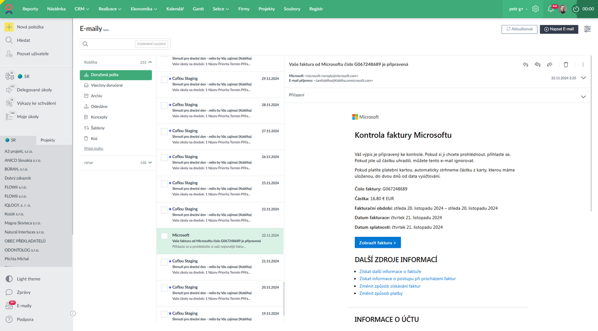 - Automatické ukládání komunikace. Propojte firemní e-mail s CRM, aby se veškerá komunikace propisovala přímo k danému kontaktu nebo zakázce. V případě potřeby tak snadno dohledáte historii a pokračujete tam, kde jste skončili.