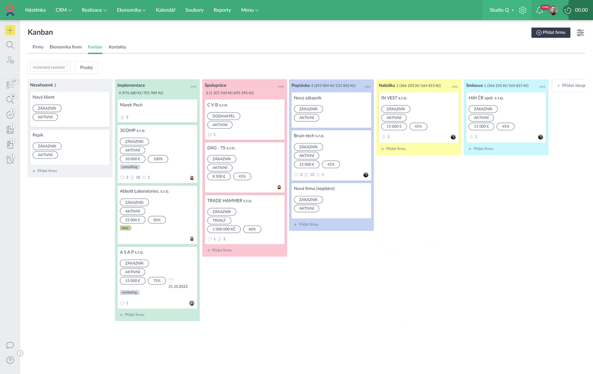 - Jednotná evidence kontaktů. Ukládejte si klienty, zájemce i dodavatele přehledně na jednom místě – včetně informací o firmě, odpovědných či kontaktních osobách a interních poznámek. Když má každý člen týmu přístup ke stejným datům, nehrozí nedorozumění. Fakturační údaje můžete načítat a aktualizovat podle IČO přímo z obchodního a živnostenského rejstříku.