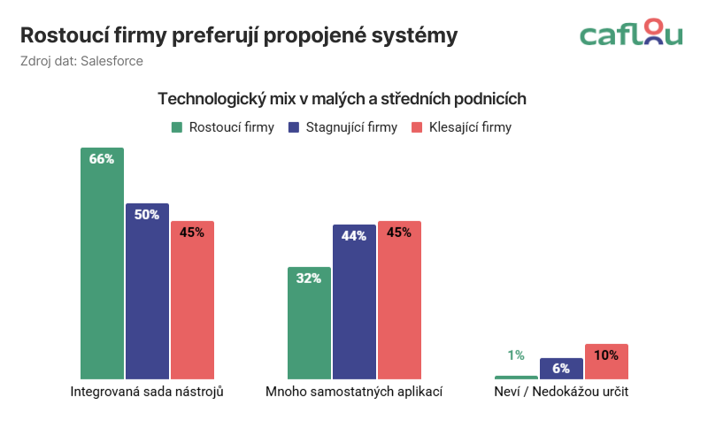 Rostoucí firmy preferují propojené systémy – buď jim přímo pomáhají růst, nebo si mohou dovolit investovat do pořádku v nástrojích. Lídři klesajících podniků naopak 10× častěji netuší, na čem jejich byznys technicky stojí.