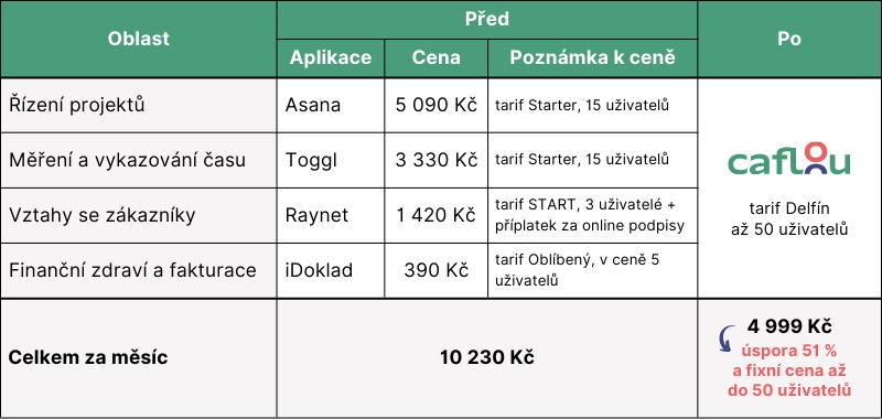 Příklad, jak marketingová agentura s 15členným týmem ušetřila díky Caflou (měsíční platby, ceny bez DPH, kurz EUR a USD ze dne 11. 4. 2025)