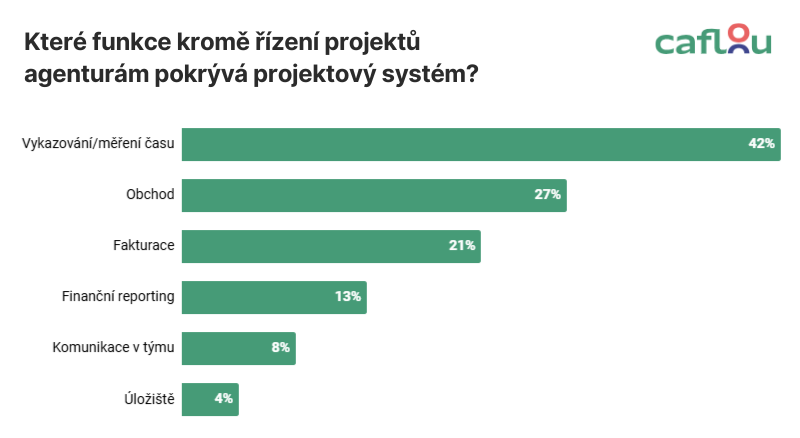 Jak ukazují data z našeho průzkumu, české agentury využívají pro další agendy svůj projektový nástroj – typicky jde o měření času, obchod nebo fakturaci. Některé oblasti ale stále řeší odděleně nebo v Excelech.