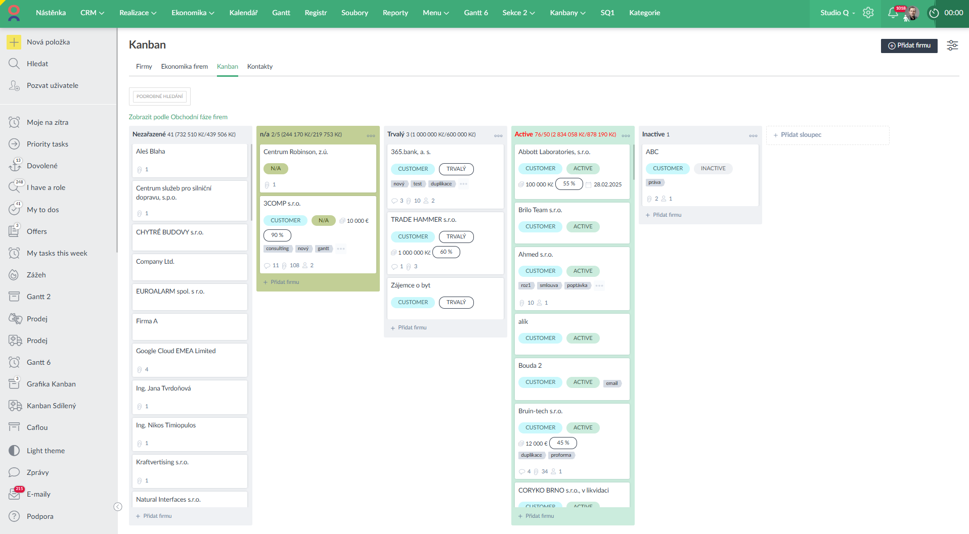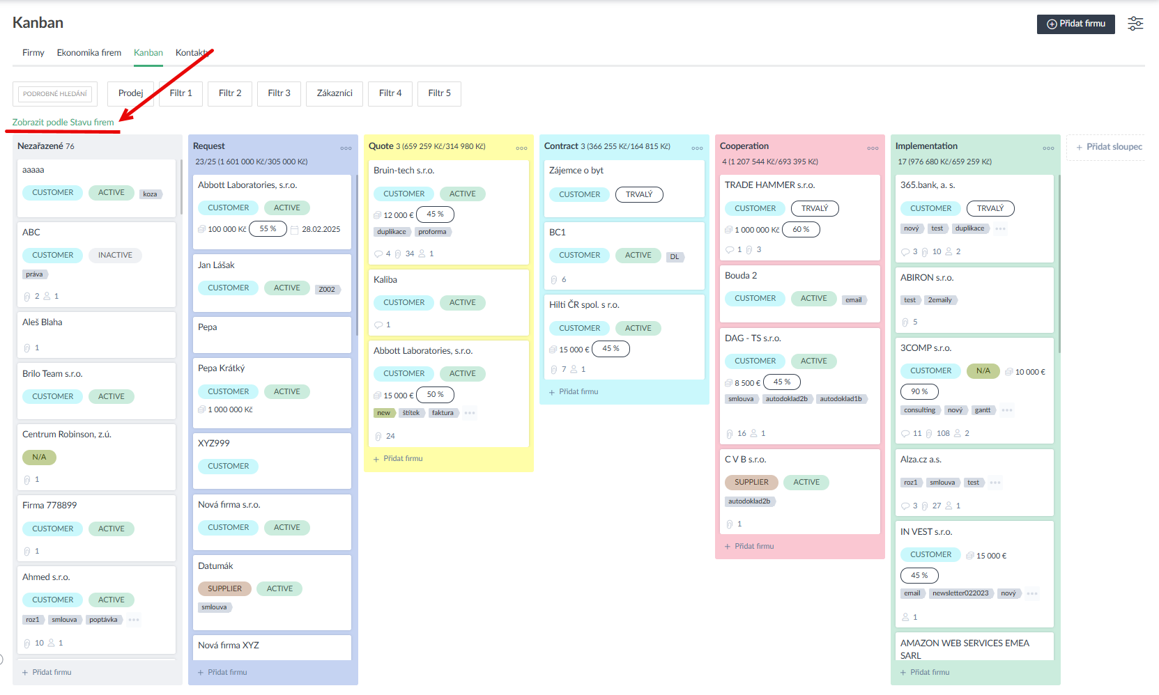 - Kanban firem doposud zobrazoval firmy jen dle obchodní fáze. Nově je možnost si zobrazit Kanban i podle Stavu firem (Ukázka zde a zde >).