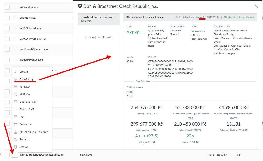 - Caflou využívalo data Dun & Bradstreet (dříve v ČR pod značkou Bisnode) pro přehled Finanční data a scoringy, který se nachází ve Zdraví firmy. Nově tyto finanční reproty získáváme přes platformu Merk. Pro vás uživatele to znamená, že tuto službu budete moci čerpat bezplatně (Ukázka zde >).