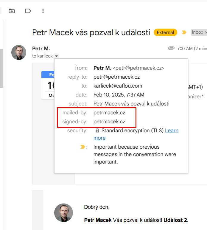 - Pozvánky z událostí v kalendáři nově chodí přes vaši ověřenou doménu (stejně jako při odesílání emailů). Pokud má váš účet ověřenou doménu a uživatel v rámci tohoto účtu vytvoří událost, pak pozvánka od tohoto uživatele dorazí z ověřené domény (Ukázka zde >).