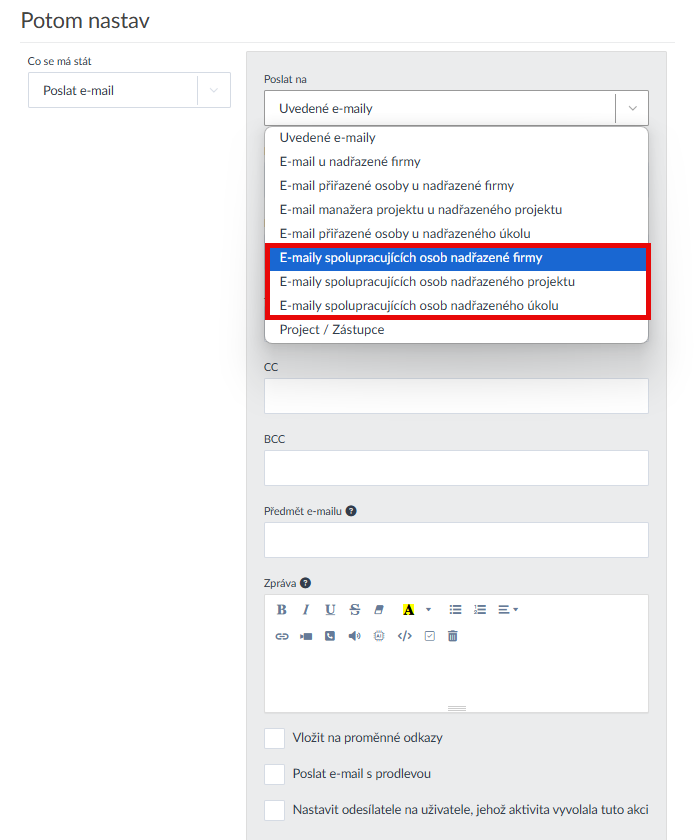 - Emaily v autoprocesech lze nyní odeslat i na všechny "spolupracující osoby" nadřazené firmy, projektu nebo úkolu (Ukázka zde >).