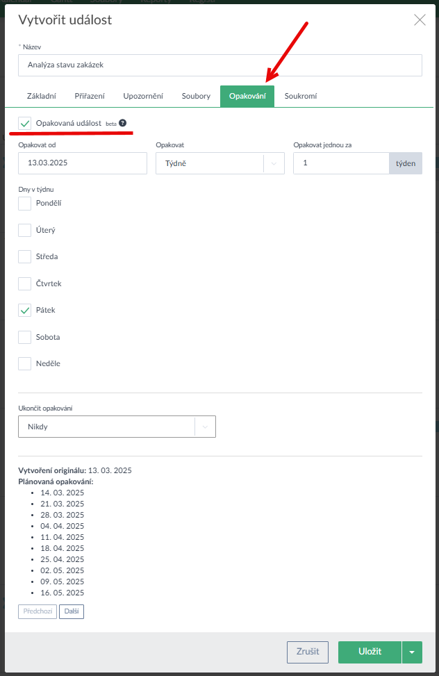 - V Kalendář máte nyní možnost nastavit opakované události. Funkce opakování funguje velmi obdobně jako např. u opakovaných úkolů (Ukázka zde >).