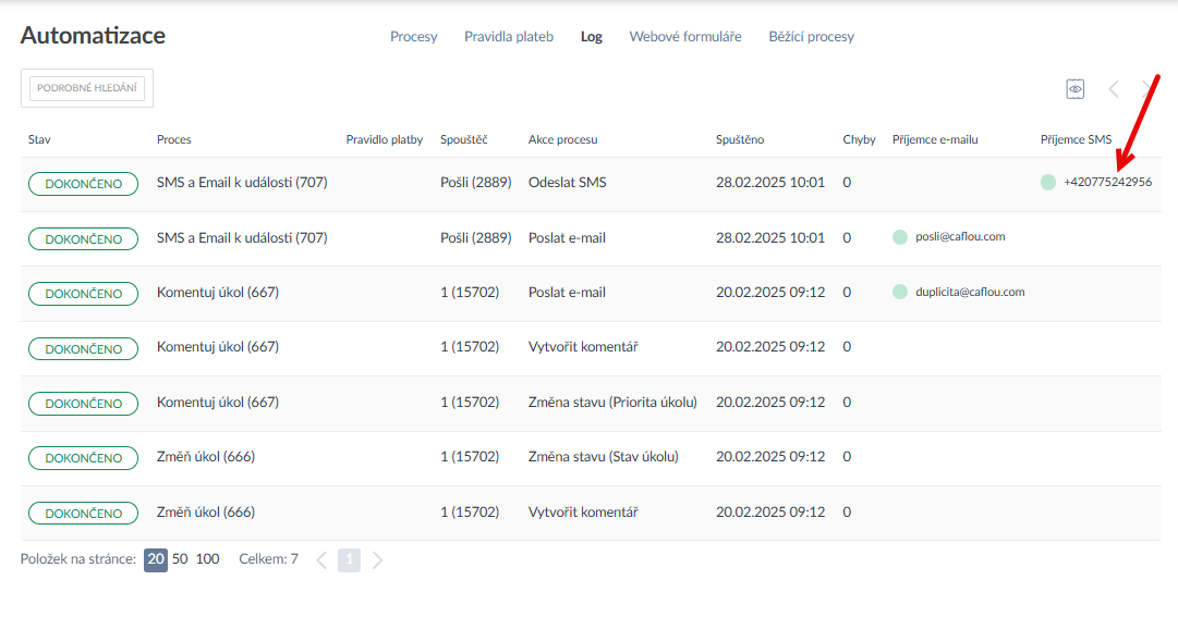 - V Logu autoprocesů máte přehled o odeslaných emailech (kam byl odeslán a zda byl doručen), nově je toto i u SMS zpráv. Máte tak jasný přehled na jaké telefonní číslo byla zpráva odeslána a zda byla doručena (Ukázka zde >).
