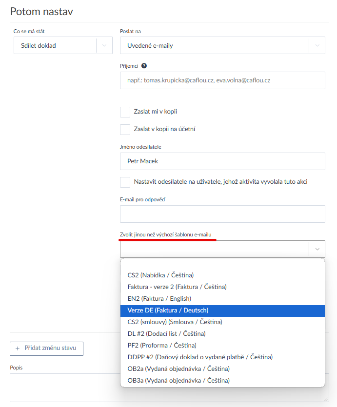 - Jestliže využíváte v autoprocesech akci "Sdílet doklad", máte zde nově možnost využít přednastavené šablony textů. Nemusíte tak vkládat texty ručně, stačí zvolit vhodnou verzi textu (Ukázka zde >).
