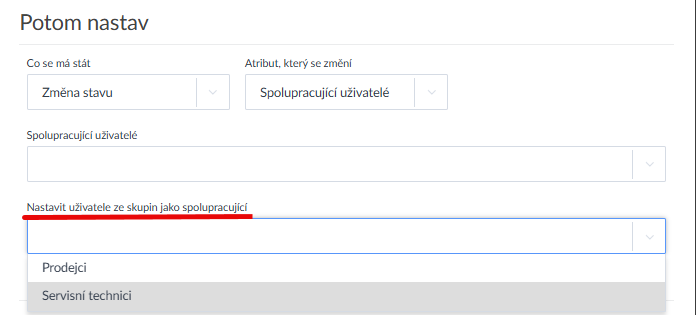 - Máte-li rozdělené uživatele ve Správě uživatelů do skupin, nově lze tyto skupiny využít i v automatizacích pro nastavení spolupracovníků. Můžete tak vybrat celou skupinu spolupracovníků pro nově vzniklou firmu, projekt či úkol nebo prostě při změně parametrů firmy, projektu či úkolu (Ukázka zde >).
