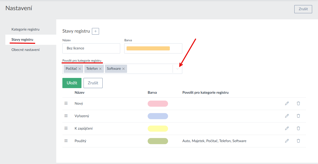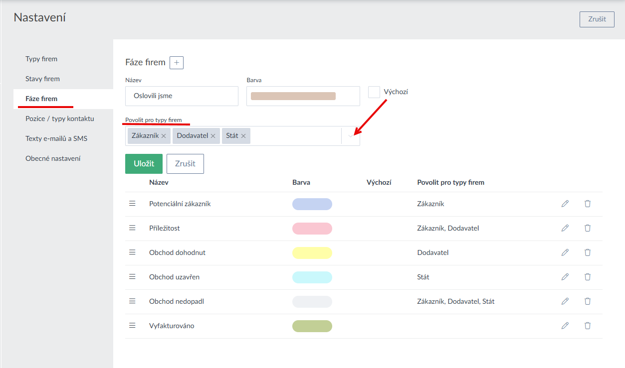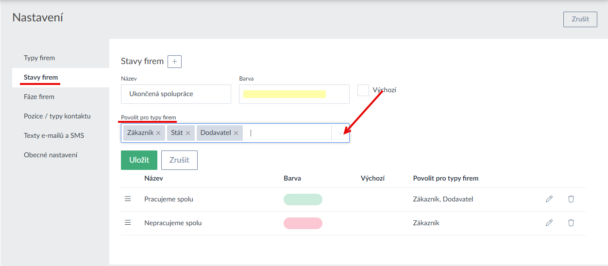- V nastavení sekce Firem je možné nově omezit, které konkrétní stavy a fáze bude možné použít pro jaké kategorie firem (Ukázka zde a zde >). Toto samé omezení lze udělat i u stavů Registru (Ukázka zde >).