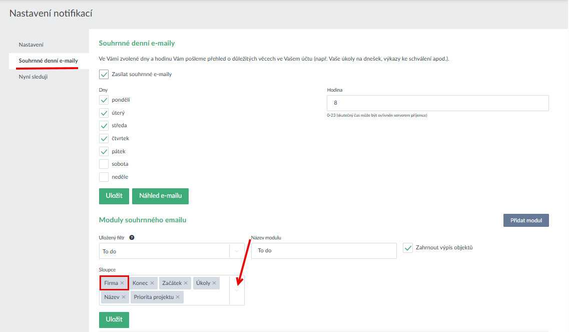 - Souhrnné denní e-maily umožňují nově zvolit sloupce, které se v rámci emailů mají ve zprávě zobrazit, doposud byly odesílané sloupečky pevně dané (Ukázka zde >).