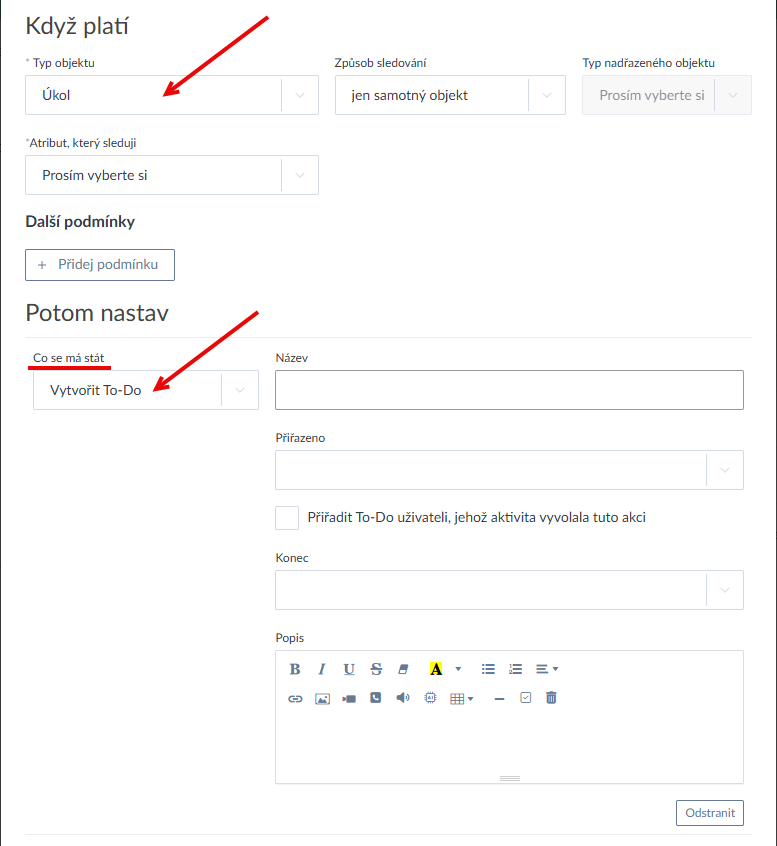 V rámci automatizací byla u sledovaného objektu Úkol nově doplněna akce "Vytvořit to-do", to bude vloženo do úkolu, který se v rámci procesu sleduje (Ukázka zde >).