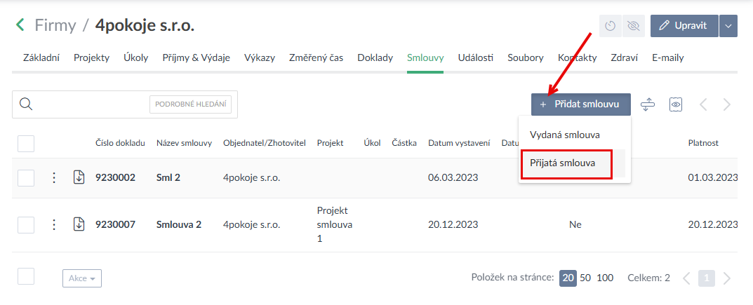 - V detailu firmy/projektu/úkolu lze nyní evidovat a přidat přijatou smlouvu (Ukázka zde>).